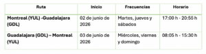 La aerolínea bandera de Canadá, Air Canada, refuerza su apuesta por el Aeropuerto Internacional de Guadalajara, con un nuevo servicio: a partir del próximo 2 de junio operará la ruta directa hacia Montreal, fortaleciendo la conectividad internacional de Jalisco.